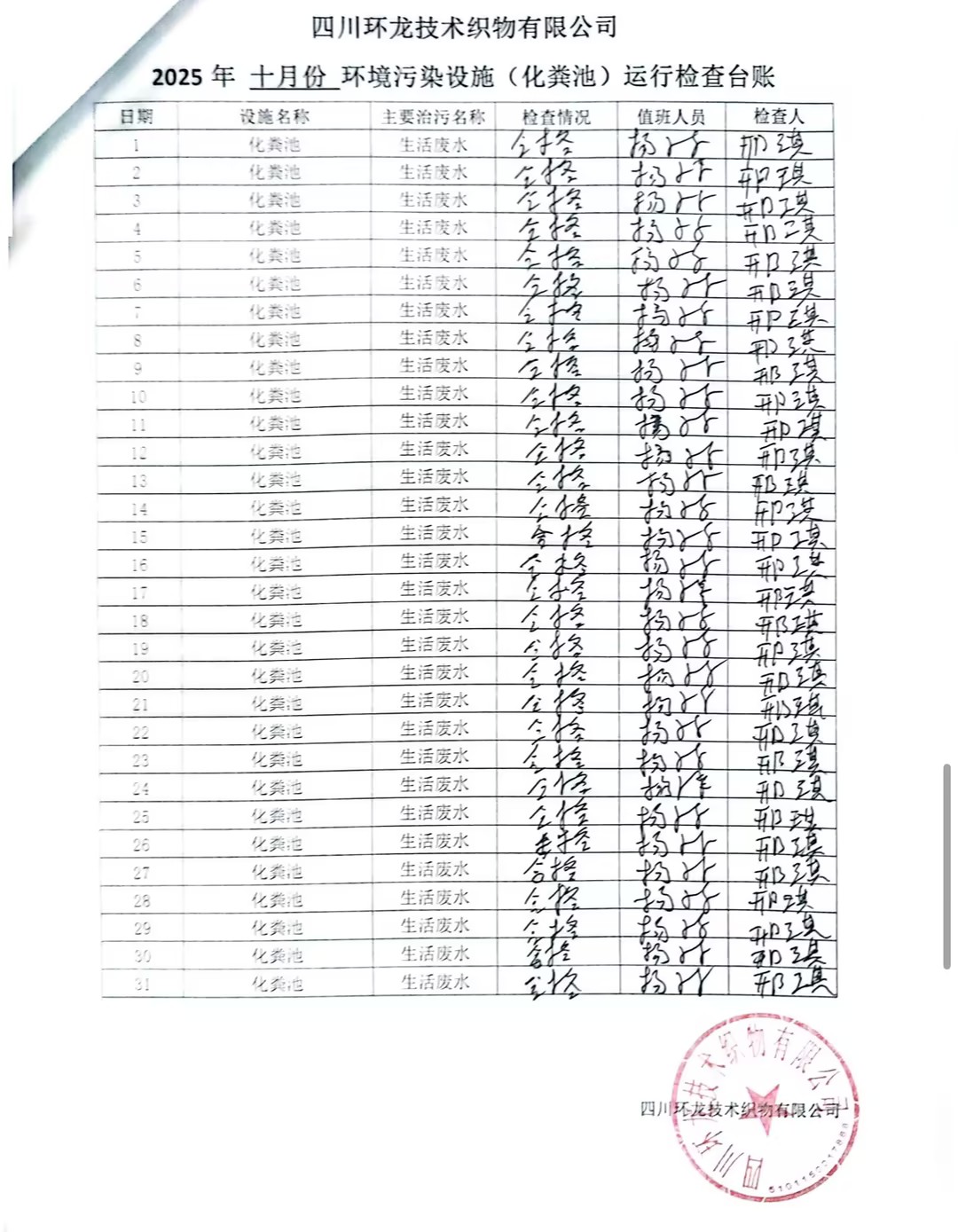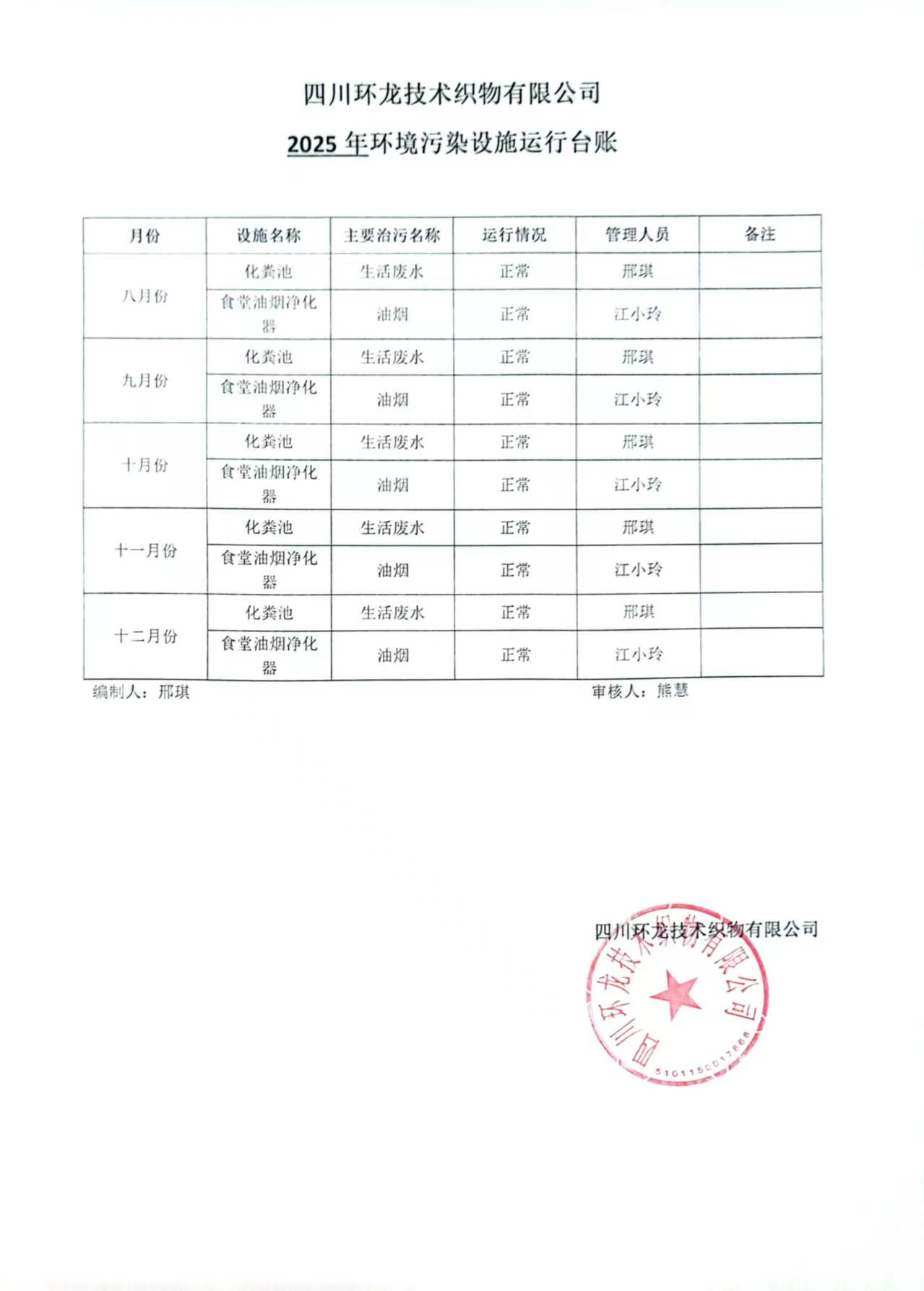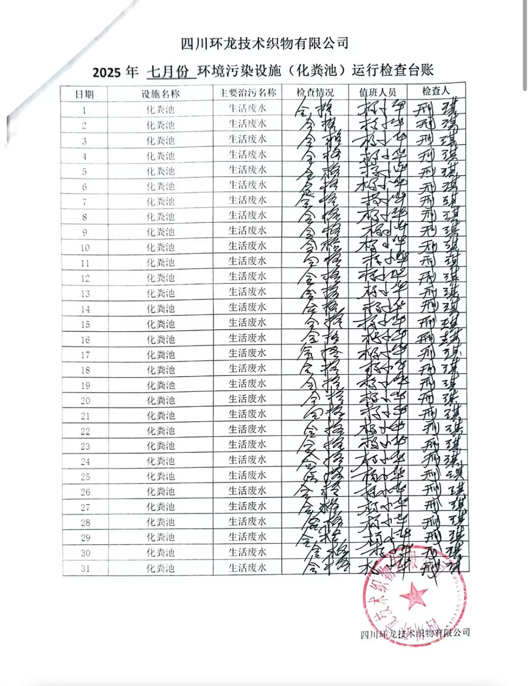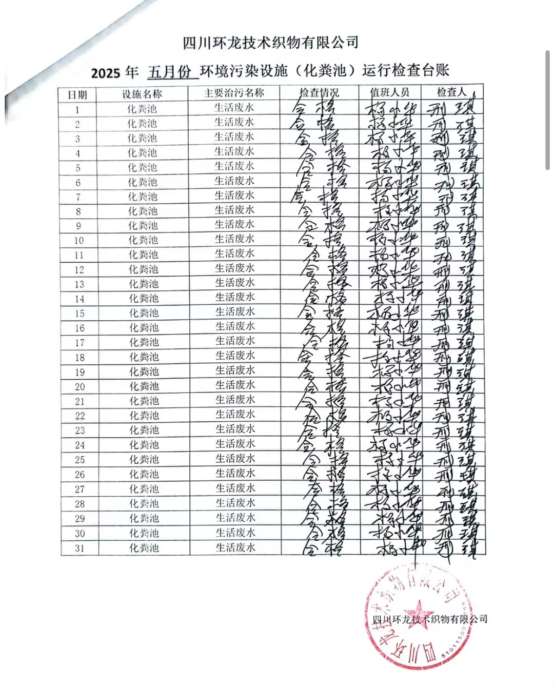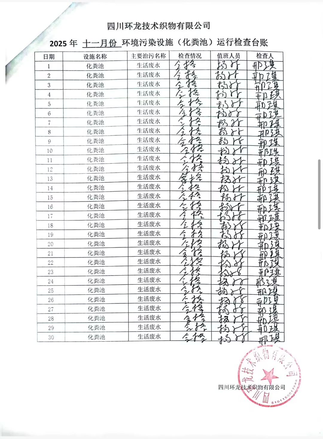 油烟净化器、化粪池运行台账